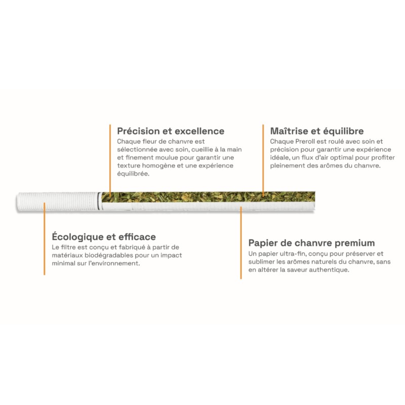 Pour préserver les qualités organoleptiques de ces cigarettes de qualité, nous recommandons une conservation dans un environnement frais et sec, à l'abri de la lumière directe. Cette précaution maintient l'intégrité des cannabinoïdes et préserve la fraîcheur des fleurs de chanvre utilisées dans la fabrication.